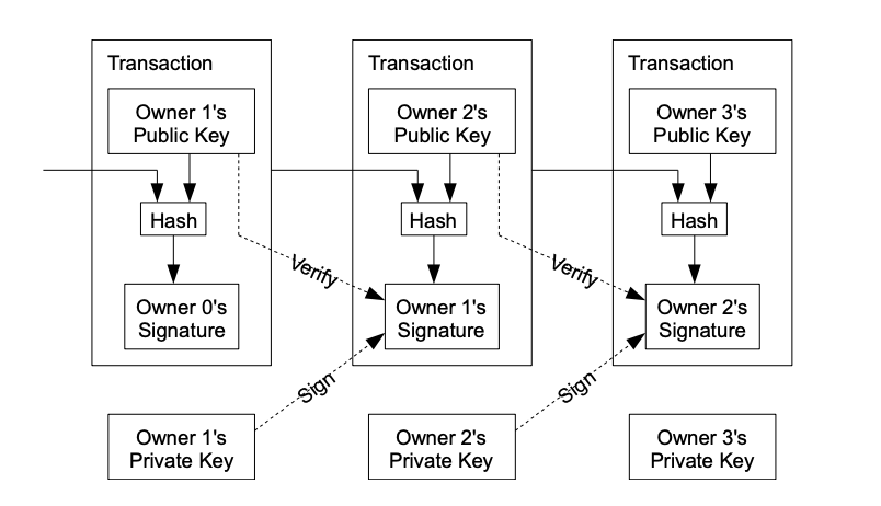 The process can be understood through the way transactions are signed and verified. The figure below shows how ownership passes from one party to another, with each transfer confirmed by the network.